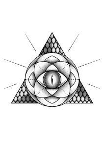 Es por eso que también usamos el símbolo del triangulo con el ojo del conocimiento, con detalles de escamas de serpiente y el iris del ojo reptil, representando nuestro ser más ancestral y puro, conectado con nuestro cerebro primario, y rodeado de geometría sagrada, y con el detalle de las rayas laterales, que combinado con la apertura del ojo toma un significado de despertar (tomar consciencia).